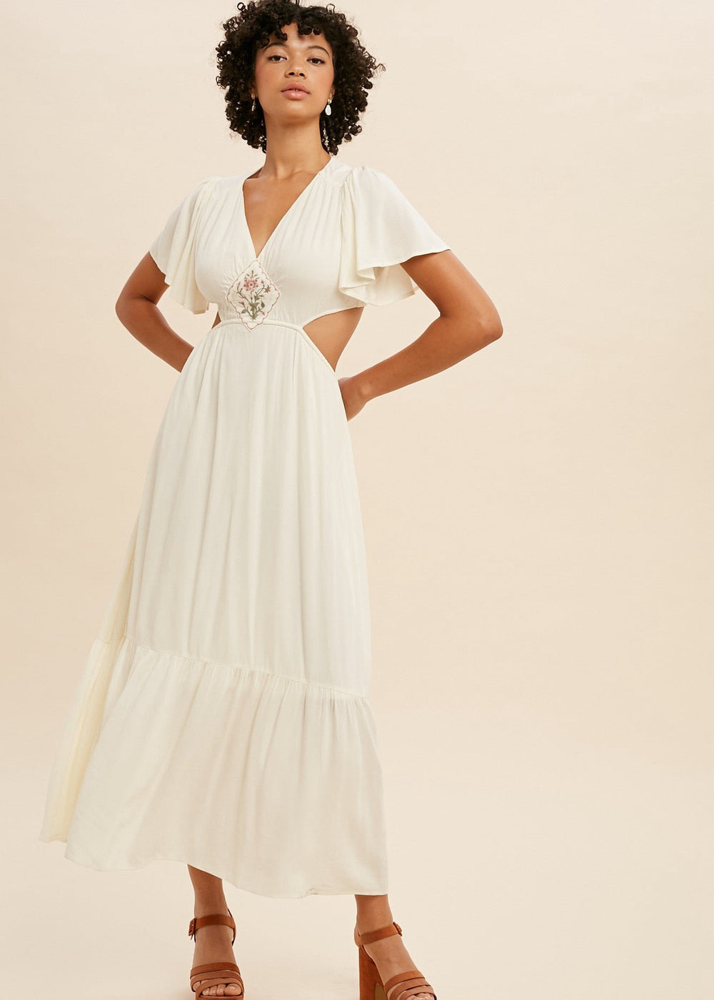 Featuring a flattering V-neckline and soft flutter sleeves, the dress is accented with delicate embroidered detailing at the bodice, adding a refined, artisanal touch.
