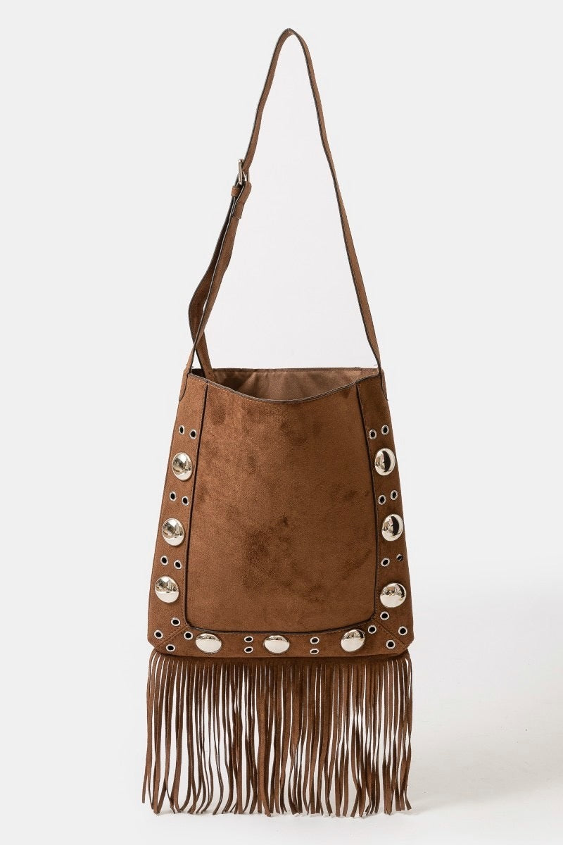 This tote features eye-catching faux suede fringe with grommet details. It’s the perfect accessory to elevate your style with a laid-back, fashionable vibe.