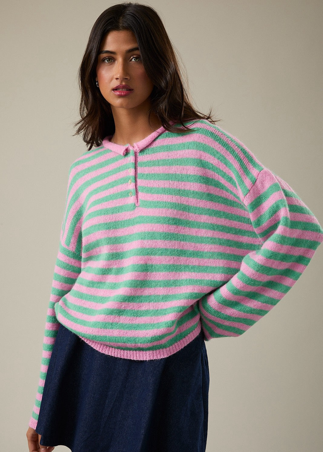 Add a pop of color to your wardrobe with this pink and green striped half button sweater, designed for both comfort and effortless style. This long sleeve knit pullover features a relaxed silhouette, classic horizontal stripe pattern, and a chic half button neckline that adds a modern touch.