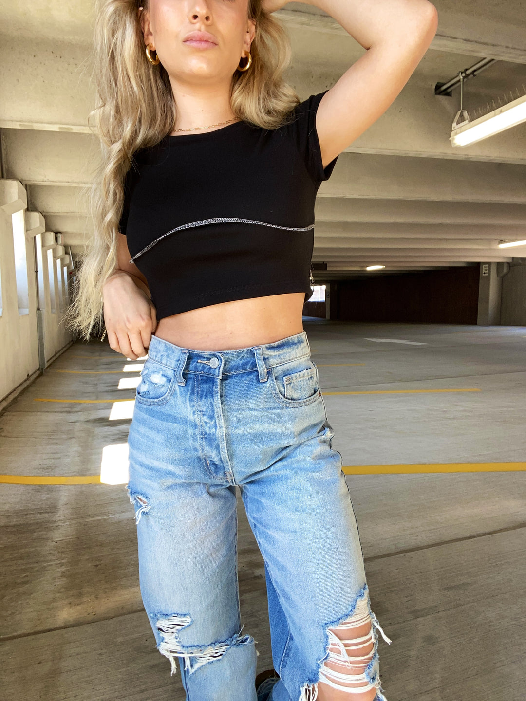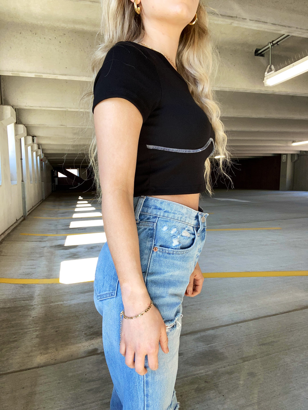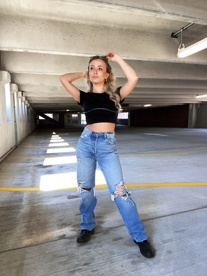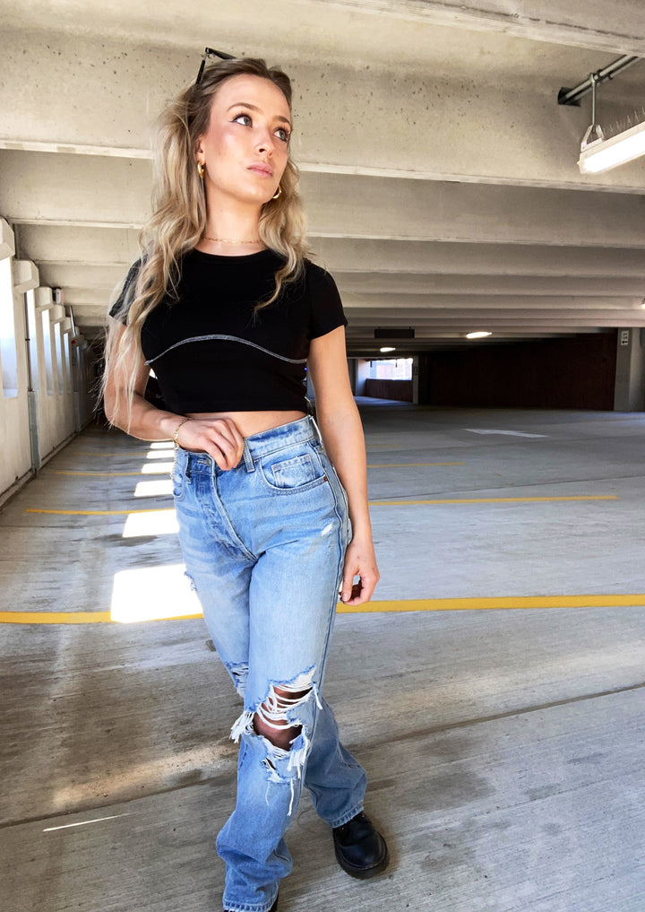Black mid-length short sleeve top with white seam detail across the front