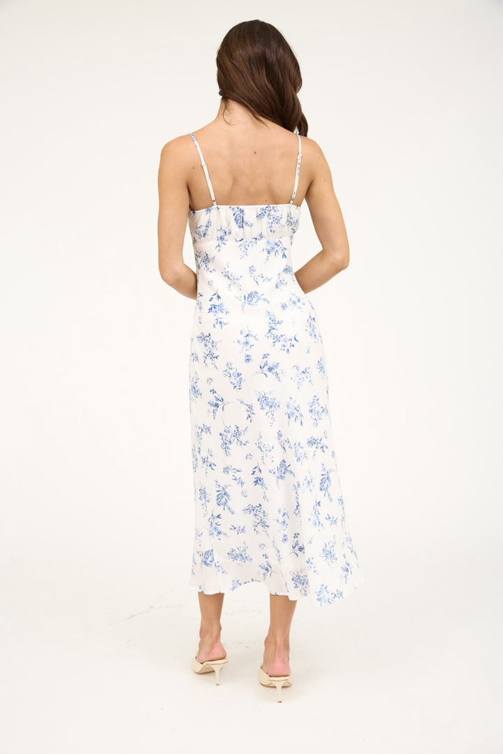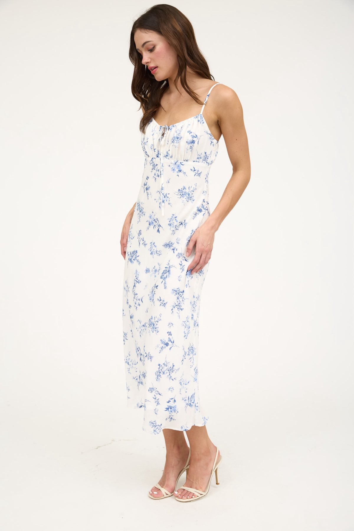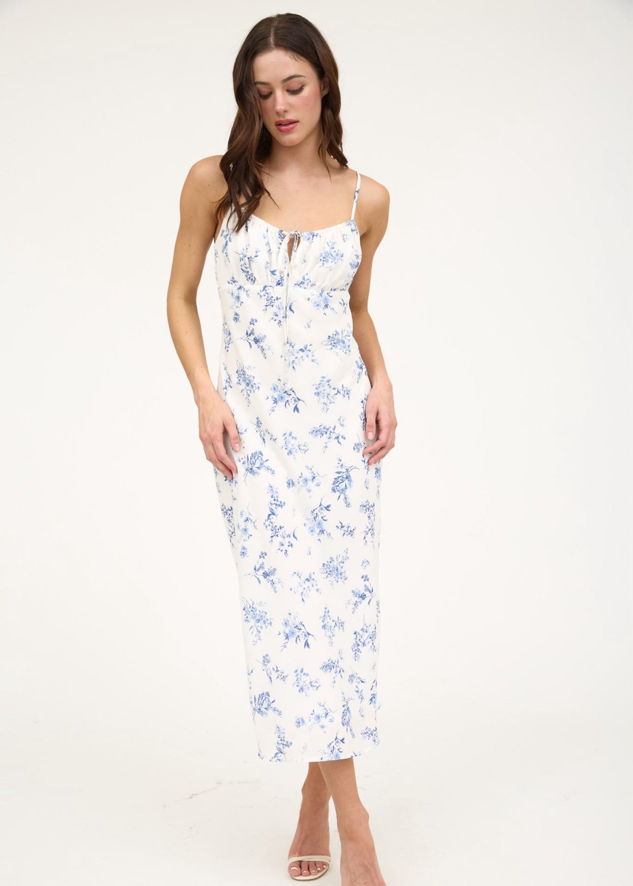 Embrace timeless romance in the Celeste Slip Dress, a dreamy blue and white floral midi dress perfect for spring and summer. This effortlessly elegant piece features delicate spaghetti straps, a subtle tie-front neckline, and a flowy silhouette that skims the body in all the right places. Made with lightweight, breathable fabric, the blue floral print on a white background gives it a classic cottagecore-meets-modern look. Ideal for brunch dates, weddings, or beachside evenings, this feminine floral slip dress will become your go-to for any warm-weather occasion.