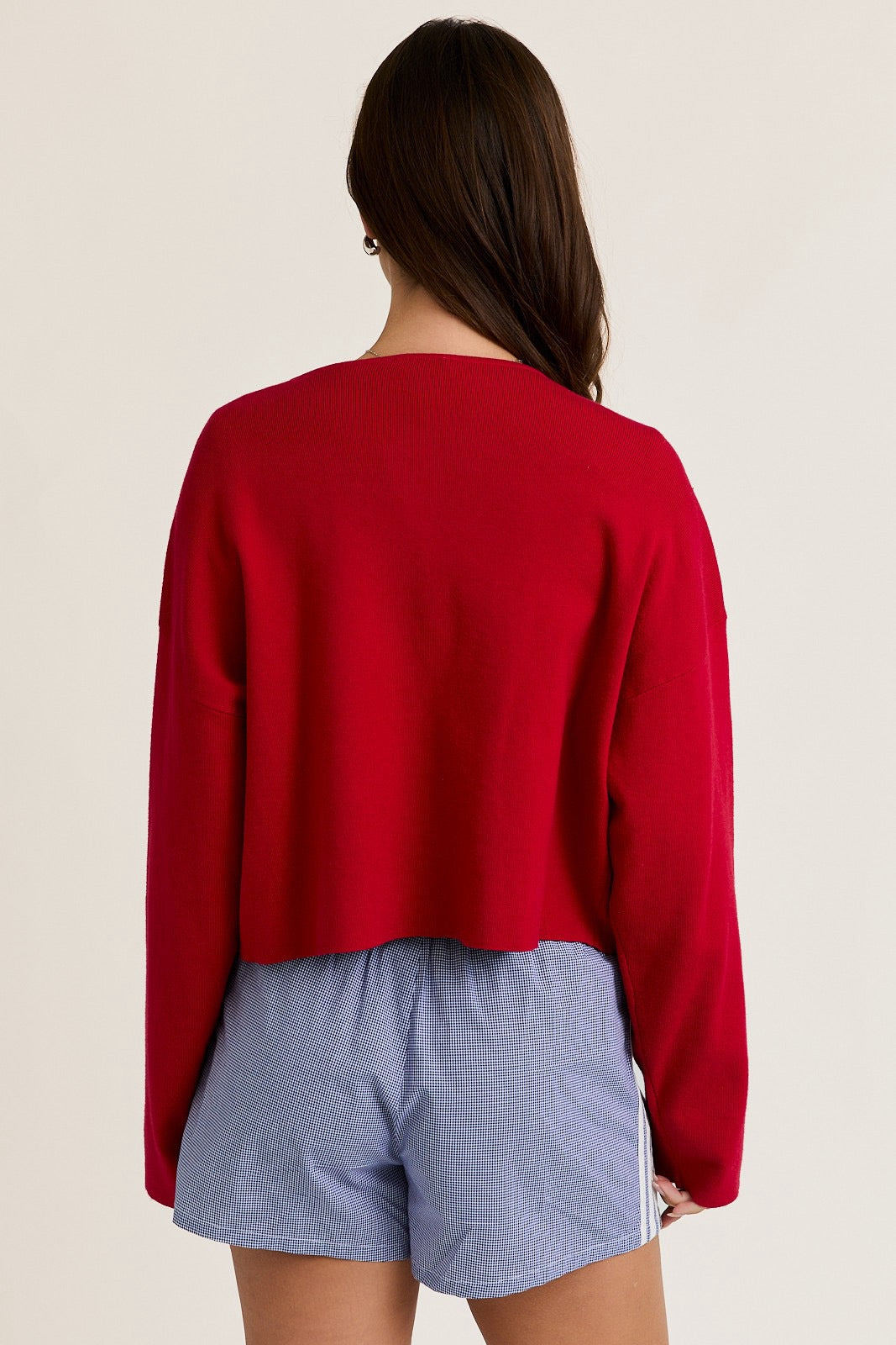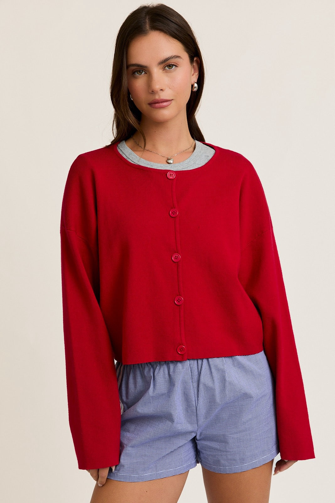 Add a pop of color and a layer of comfort with our Cropped Red Cardigan, a must-have for breezy summer nights and effortless layering. Made from a soft, breathable knit, this vibrant button-up features a flattering cropped cut, full-length sleeves, and a classic crew neckline. Its lightweight feel makes it ideal for pairing over tanks, tees, or dresses—perfect for Memorial Day BBQs, firework shows, or casual daywear with a patriotic twist.
