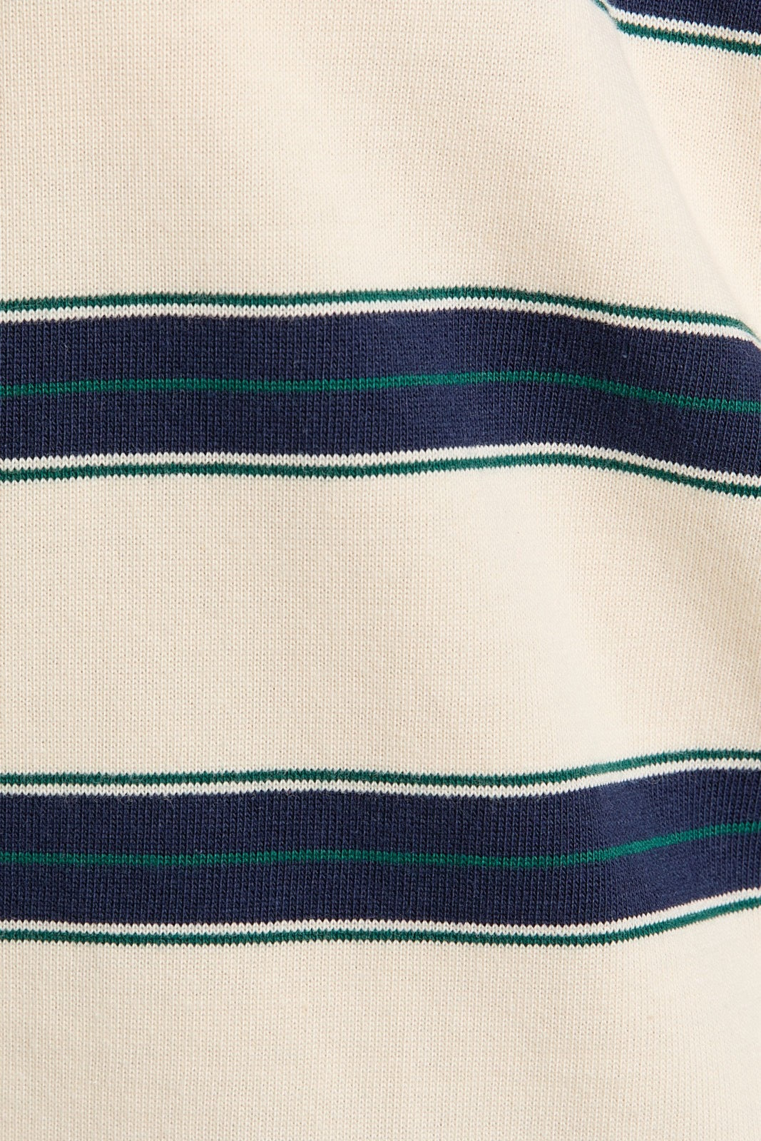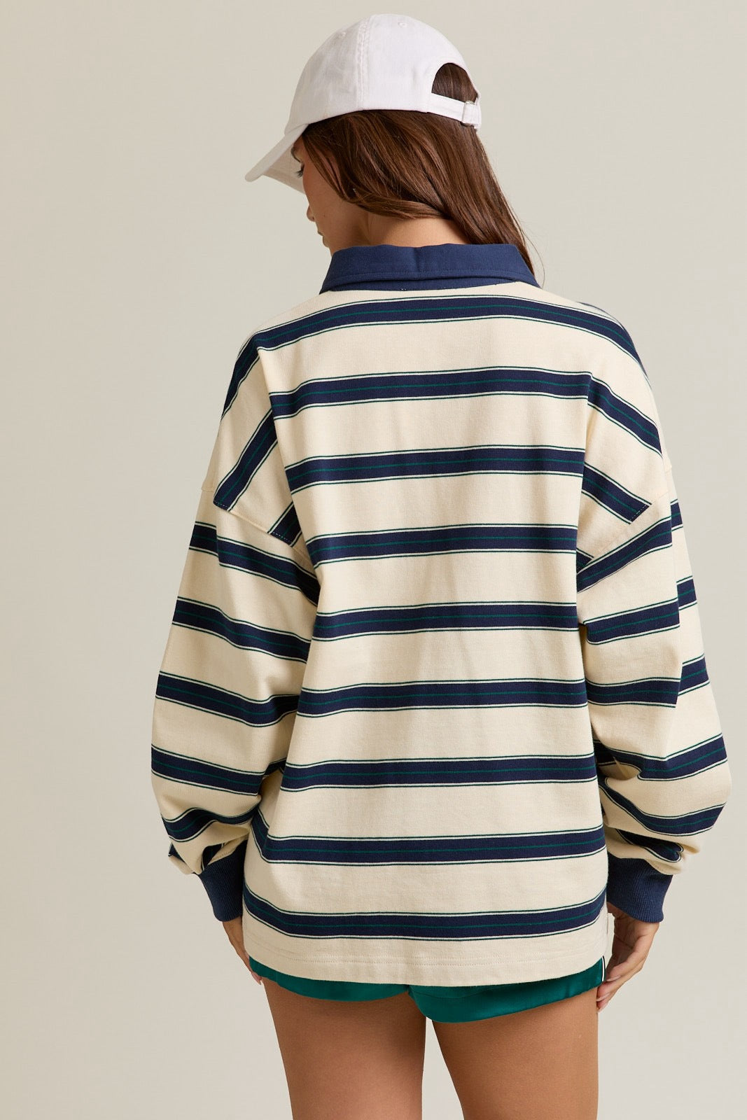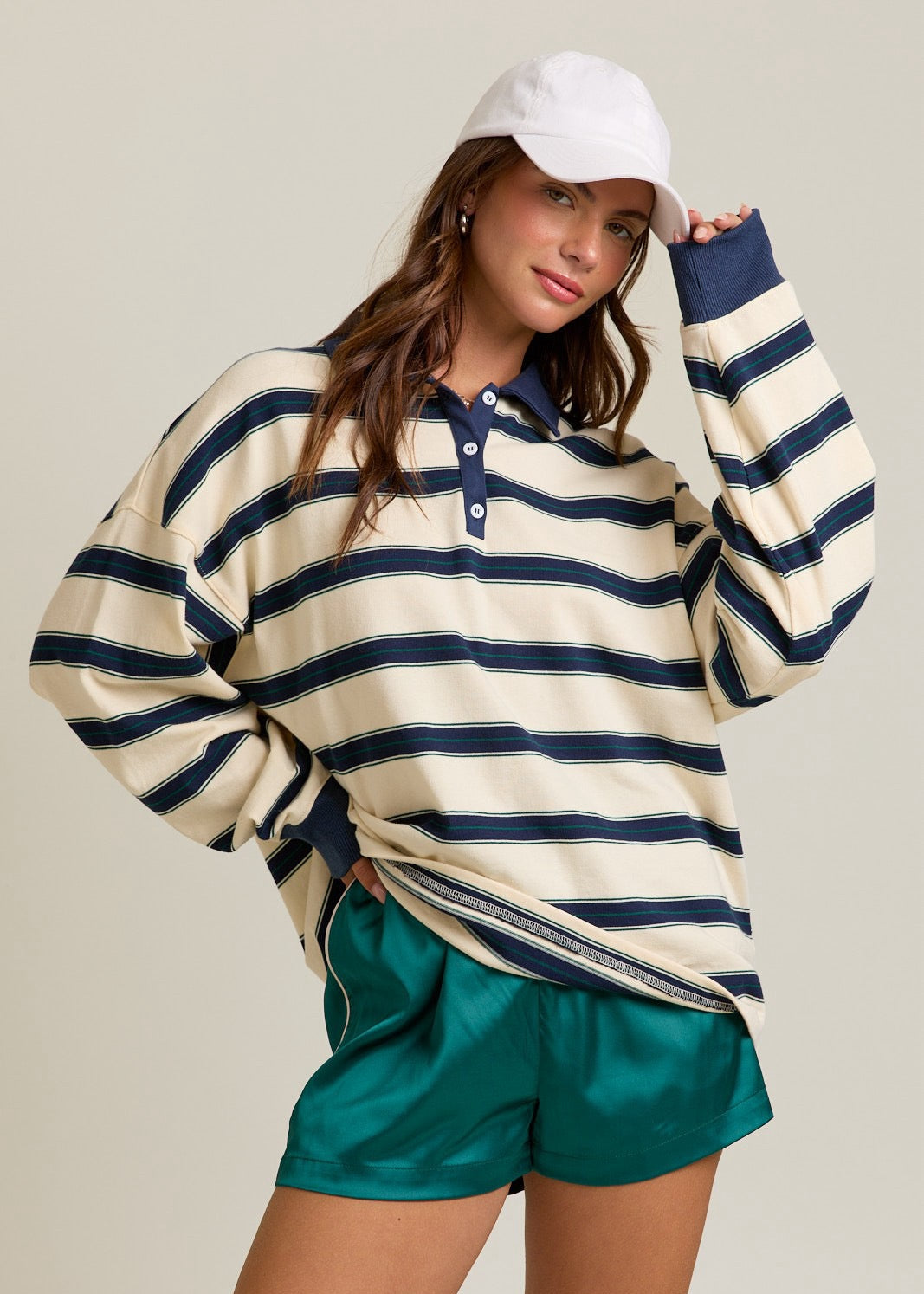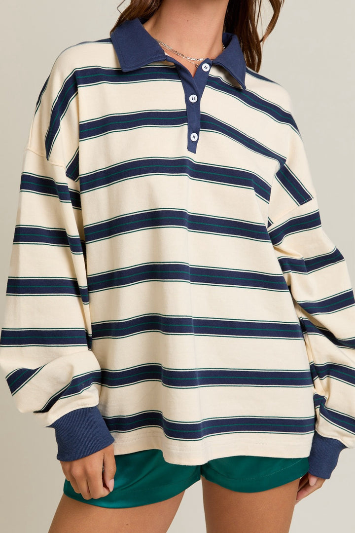 Channel classic collegiate cool with our Varsity Striped Rugby Pullover. Crafted from 100% breathable cotton, this oversized long-sleeve top features bold horizontal stripes in navy and forest green on a creamy ivory base. A structured contrast collar and three-button placket give it that timeless rugby-shirt edge, while ribbed cuffs add a cozy finish. With its relaxed, loose fit and sporty aesthetic, this collared pullover is perfect for layering over bike shorts or styling solo with denim for a laid-back, vintage-inspired look.