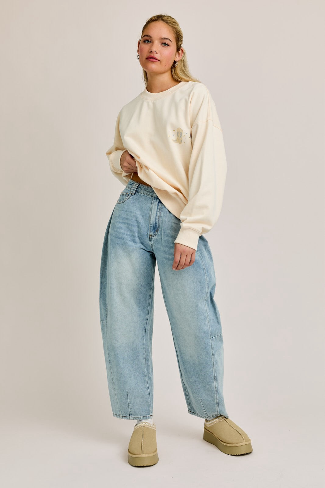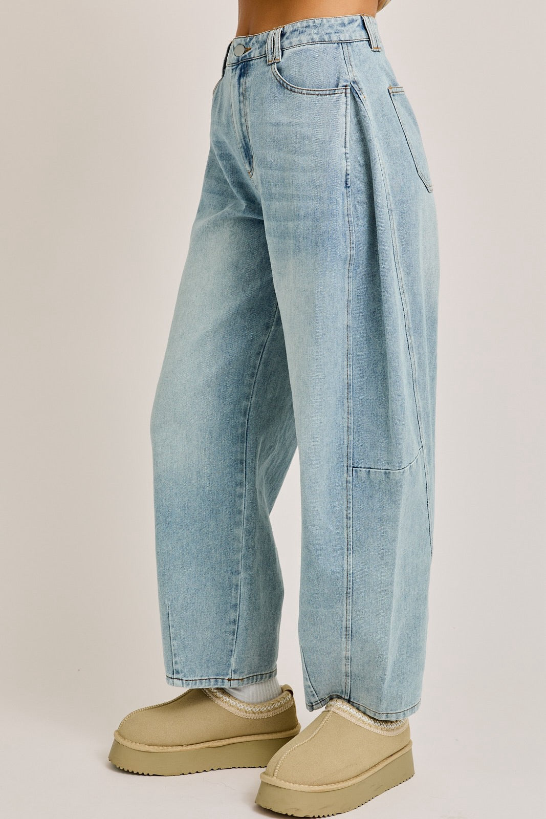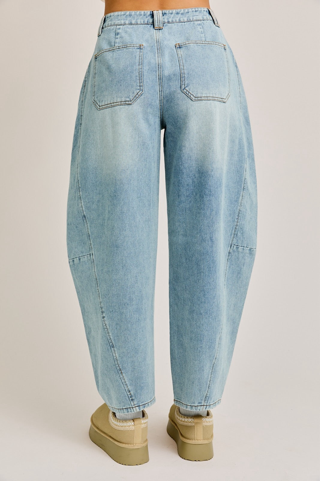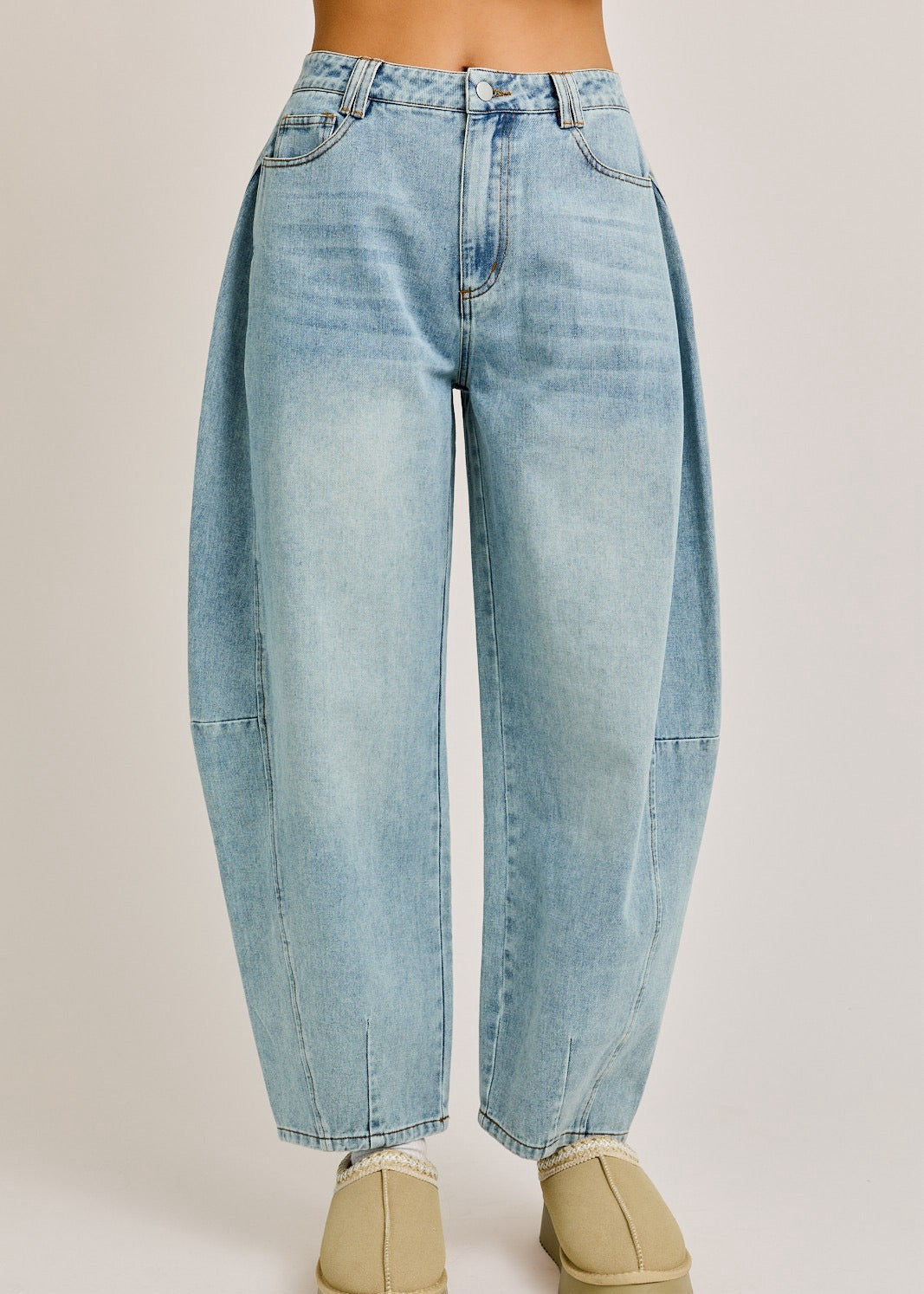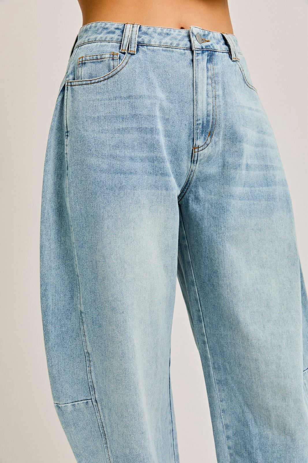 Make a bold statement with these High-Waisted Barrel-Leg Jeans, the ultimate blend of comfort and cutting-edge style. Crafted from premium light-wash denim, these jeans feature a unique barrel-shaped silhouette that delivers a relaxed yet fashion-forward vibe. The high-rise waist flatters your figure while offering a secure and comfortable fit, perfect for pairing with cropped tops or tucked-in blouses. Designed with classic five-pocket styling and subtle distressed details, these jeans bring an effortless, vintage-inspired charm to your wardrobe.