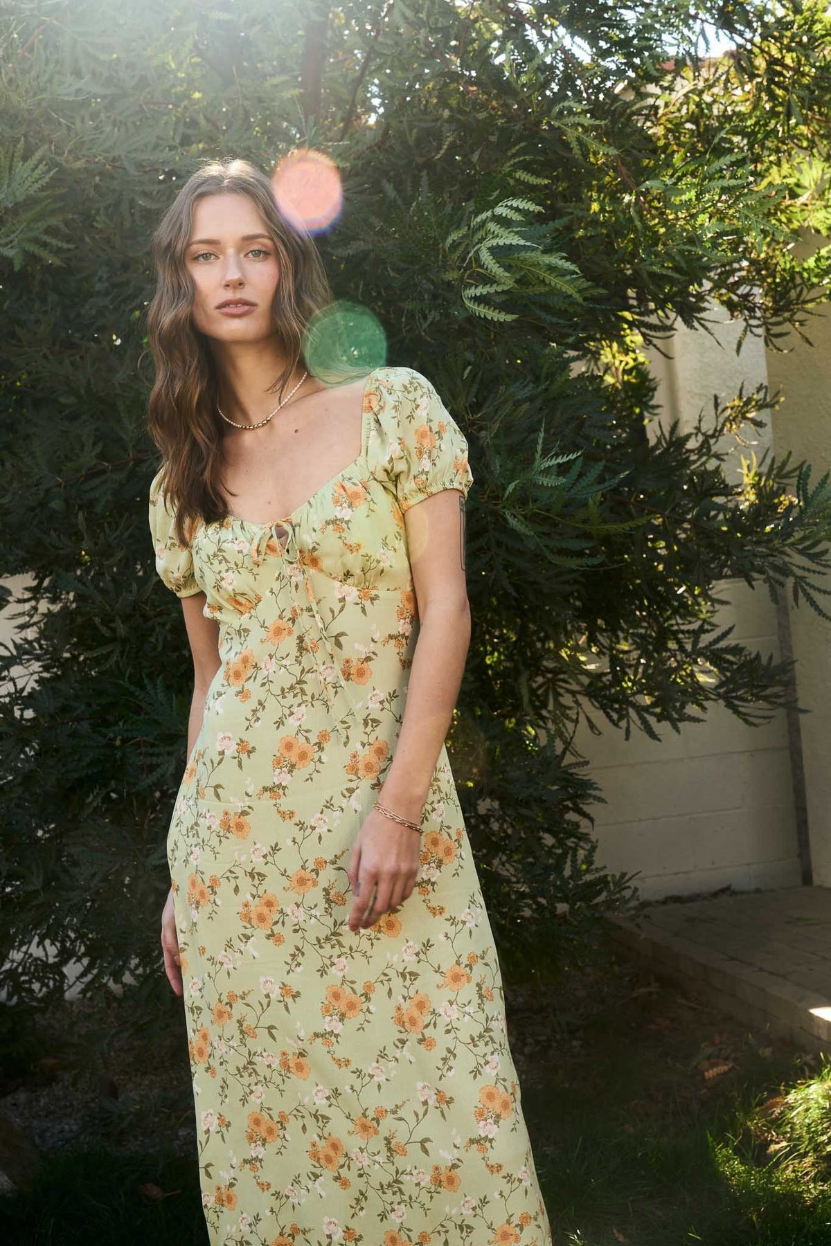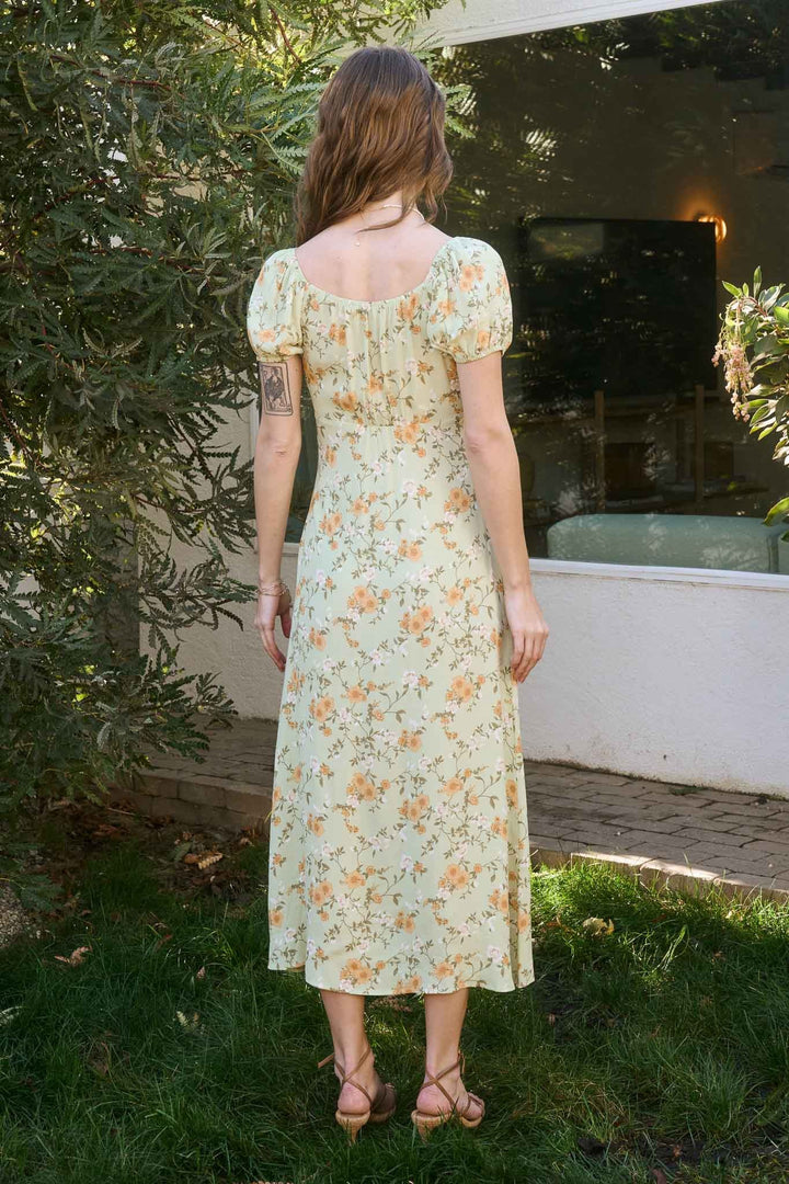 Bask in the glow of warm days with the Meadow Bloom Dress, a charming green floral midi dress that brings effortless femininity to your wardrobe. Featuring soft puff sleeves, a sweetheart neckline with subtle ruching, and a flattering A-line silhouette, this dress is adorned with a delicate orange and white flower print that feels both vintage and fresh. The lightweight, flowy fabric makes it ideal for spring picnics, summer strolls, or outdoor brunches. Style it with strappy heels or sandals for a versatile, romantic look that transitions seamlessly from day to night.
