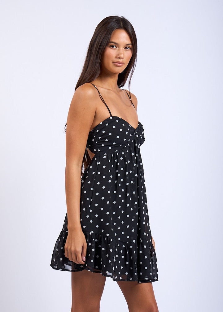 Turn heads in our Midnight Charm Polka Dot Mini Dress, a flirty and feminine piece perfect for warm weather outings or fun nights out. Featuring a classic black fabric adorned with playful white polka dots, this dress is designed with adjustable spaghetti straps and a sweetheart neckline that flatters your shape. The empire waist and breezy, A-line silhouette offer comfort and movement, while the ruffled hem adds a touch of flirtation. Pair it with boots or heels for an effortlessly chic look. Ideal for summer parties, date nights, or brunch with friends.