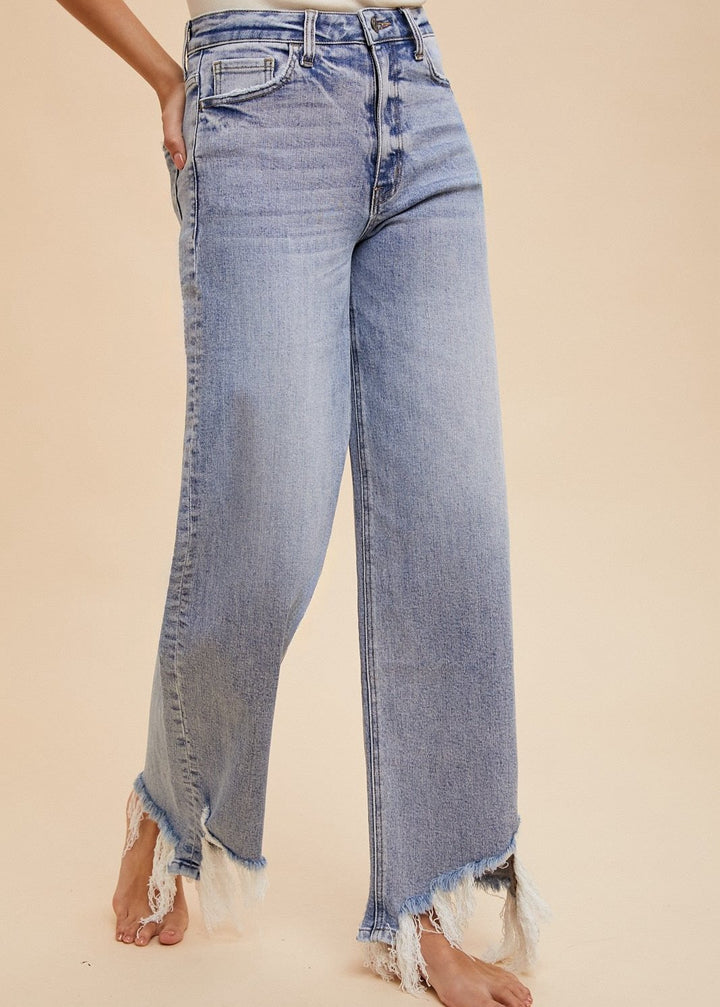 Put on these new medium wash jeans and instantly feel and look great! With a good stretch and a trendy distressed hem, these jeans offer both style and comfort.