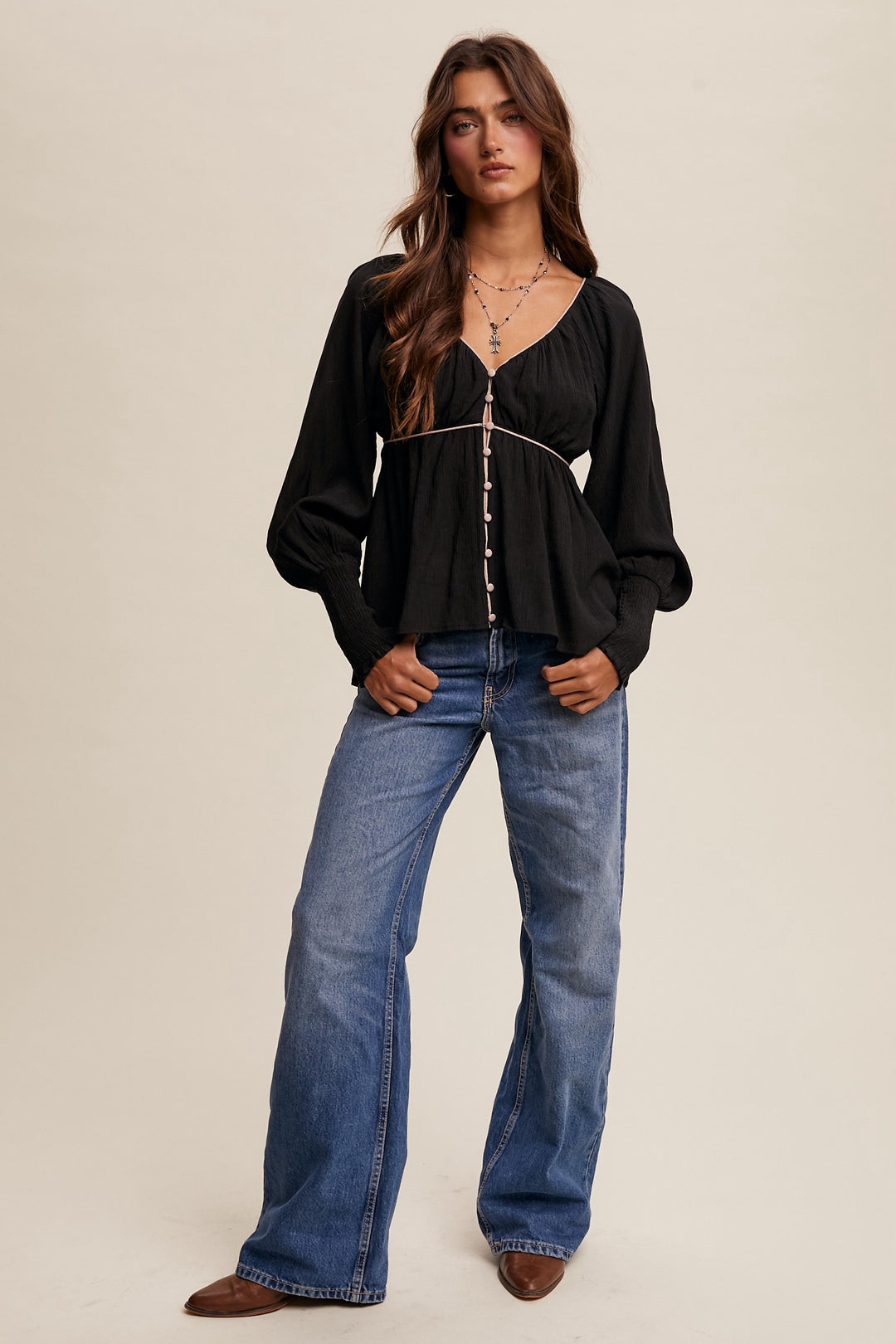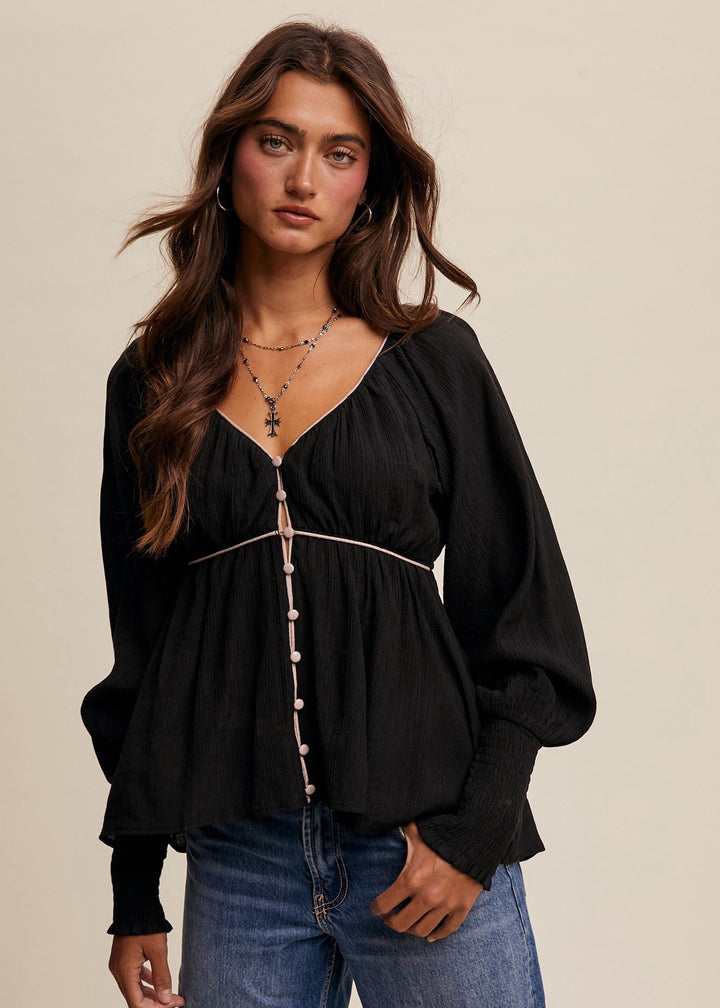 Get ready to turn heads with our new Spencer's Long Sleeve Blouse! Featuring a flirty sweetheart neckline, smocked cuffs, and stylish contrast color edge detailing, this top is sure to make a statement. Plus, it can be worn buttoned up or left open for a versatile look. Complete with a clean hem and fully lined for added comfort. Stand out and stay stylish with this must-have piece!
