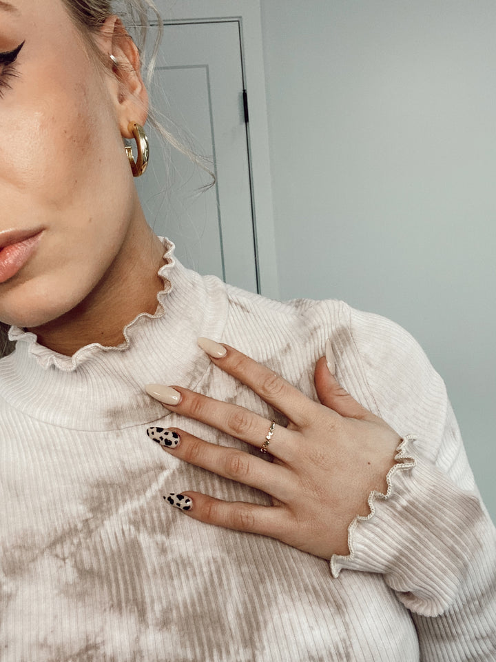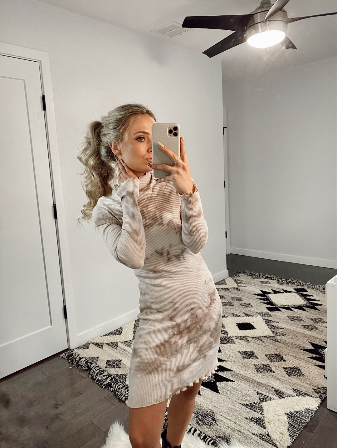 Soft fitted ribbed tie dye dress that features a lettuce mock neck and long sleeves.