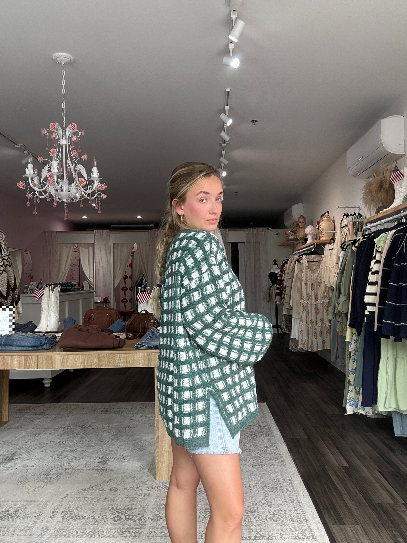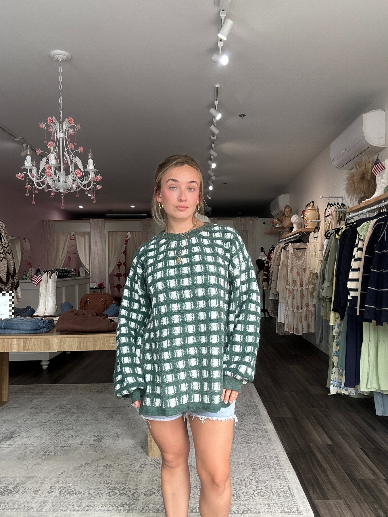 Stay effortlessly stylish and comfortable in this oversized ivory and olive checkered sweater. Designed with a relaxed fit, this cozy pullover features a bold checkered pattern that adds a touch of modern flair to your everyday look. The soft knit fabric and drop-shoulder silhouette make it perfect for layering over jeans, leggings, or shorts for a casual yet chic vibe. With its versatile design, this checkered oversized sweater is a must-have for cozy weekends, coffee runs, or transitioning seasons.